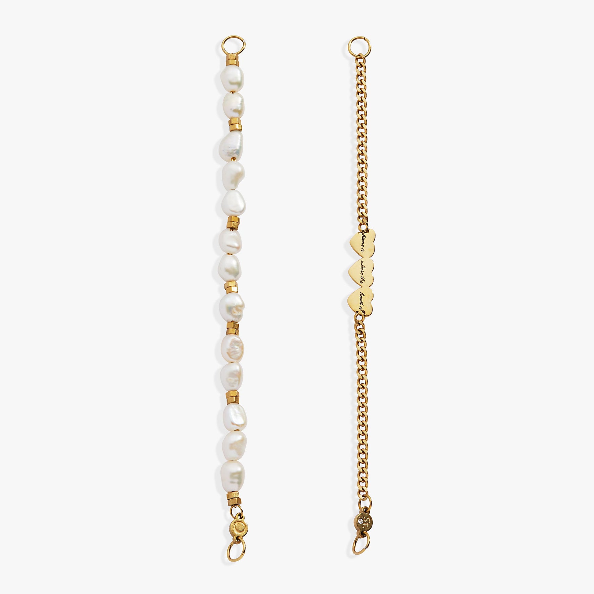 This charming bracelet set pairs a classic pearl strand with a playful, dimensional heart strand. The heart charm is delicately etched on the back with the heartfelt phrase, “Home is where the heart is,” making it a meaningful accessory that celebrates love and belonging.
