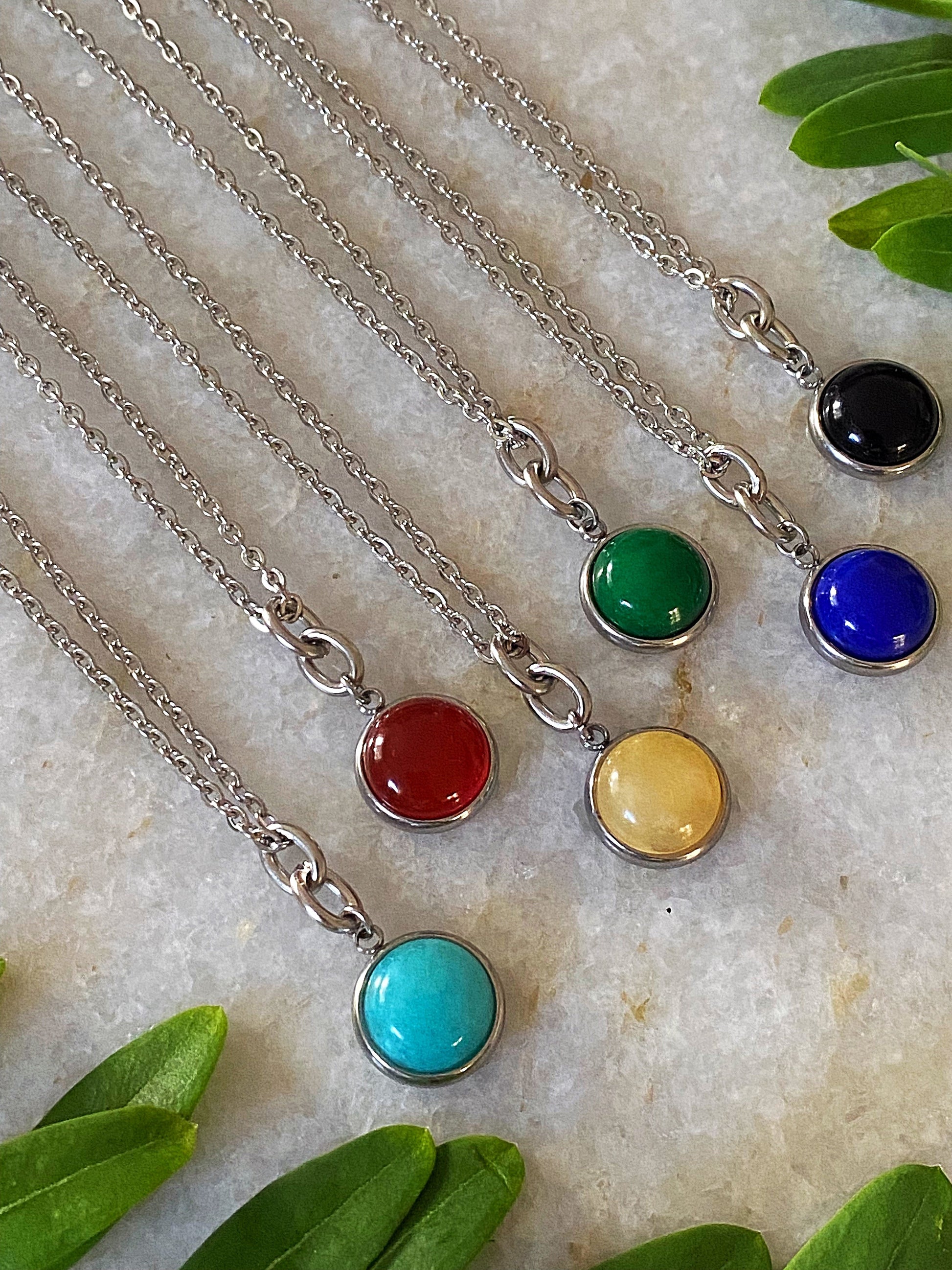 - Features a 12mm stone inlaid in a sleek silver round bezel pendant, measuring 1/2” in diameter